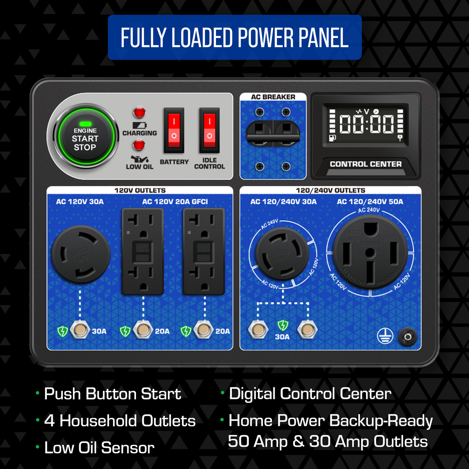 Power Panel with Multiple Outlets: Includes 4 120V 20A GFCI outlets, 1 120V 30A twist lock, 1 120/240V 30A twist lock, and 1 120/240V 50A heavy-duty outlet, offering versatility for different devices.